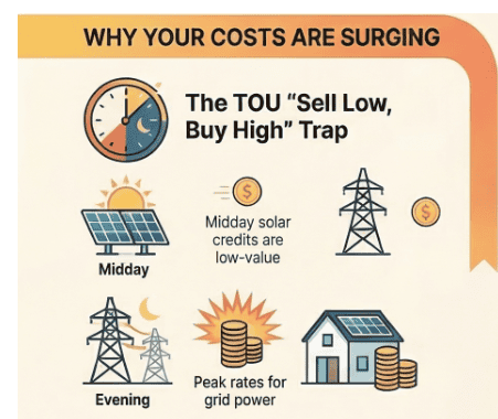 Your system may produce plenty of power during the day, yet without a battery, that excess solar is exported to the grid at lower-value time-of-export avoided cost rates, while you’re forced to purchase expensive peak Time-of-Use rates in the evening.